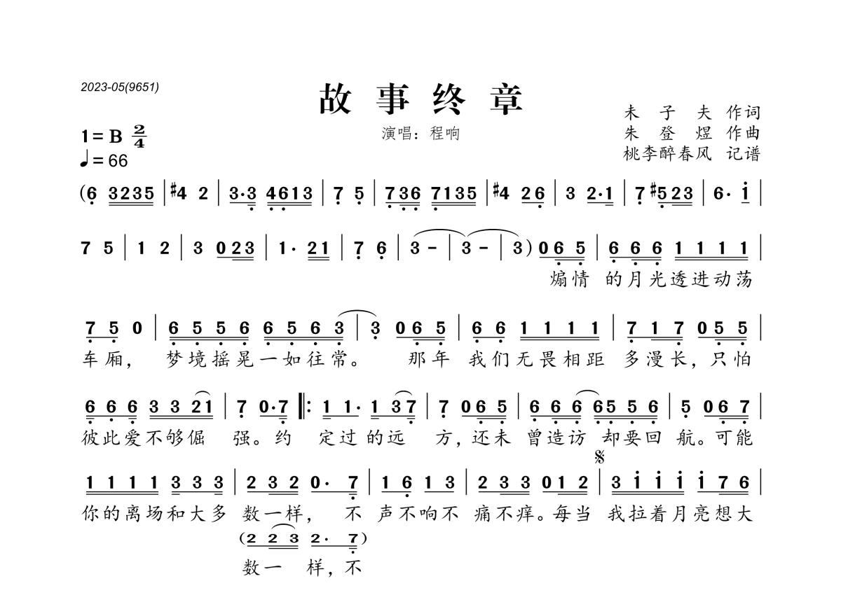 《故事终章》是程响演唱的一首歌曲,拍号为2/4拍,歌曲速度为每分钟66拍,这份简谱共有一张高清图谱,图谱由 @桃李醉春风 编配上传。