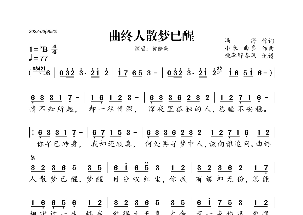 《曲终人散梦已醒》是黄静美演唱的一首歌曲,拍号为4/4拍,歌曲速度为每分钟77拍,这份简谱共有一张高清图谱,图谱由 @桃李醉春风 编配上传。