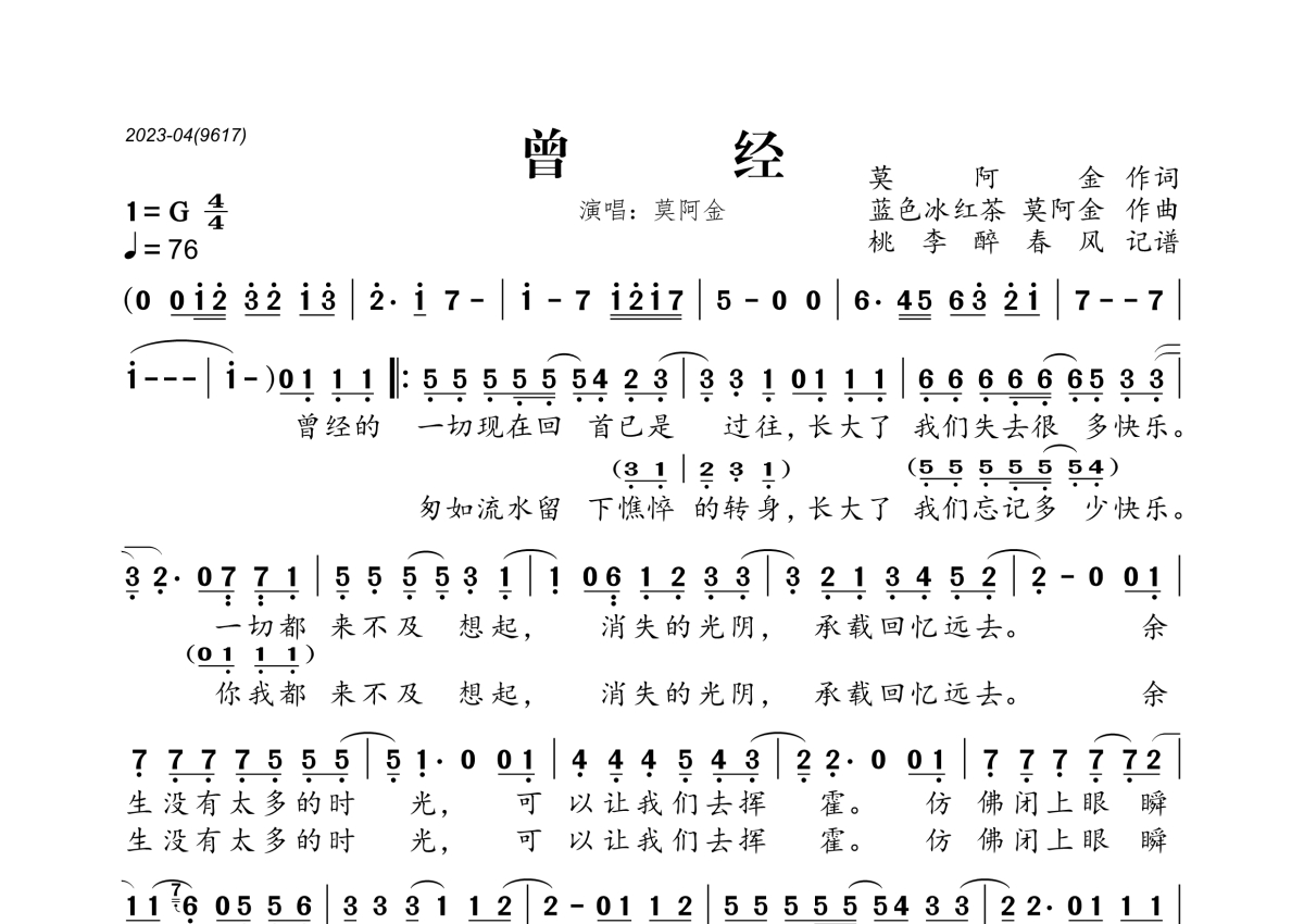 《曾经》是莫阿金演唱的一首歌曲,拍号为4/4拍,歌曲速度为每分钟76拍,这份简谱共有一张高清图谱,图谱由 @桃李醉春风 编配上传。