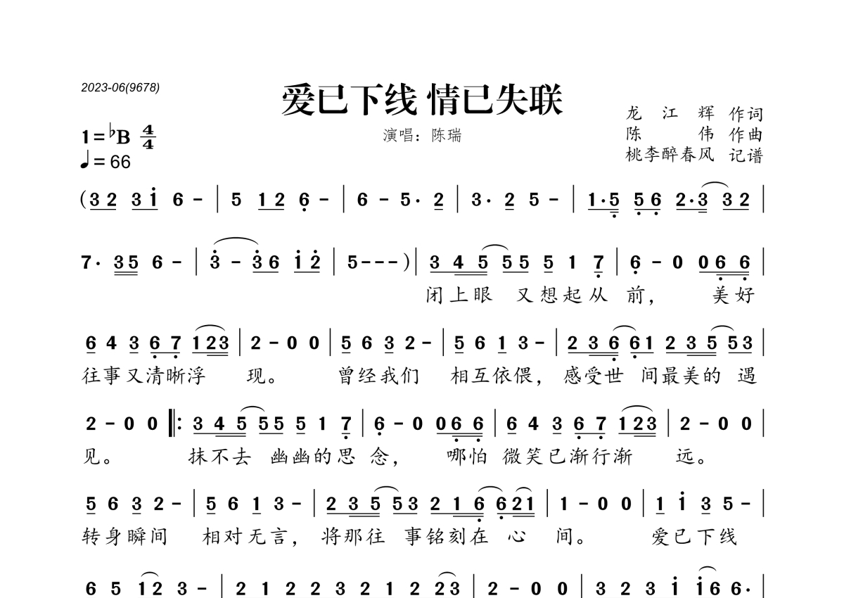 《爱已下线 情已失联》是陈瑞演唱的一首歌曲,拍号为4/4拍,歌曲速度为每分钟66拍,这份简谱共有一张高清图谱,图谱由 @桃李醉春风 编配上传。