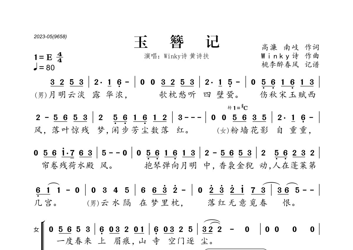 《玉簪记》是Winky诗&黄诗扶演唱的一首歌曲,拍号为4/4拍,歌曲速度为每分钟80拍,这份简谱共有两张高清图谱,图谱由 @桃李醉春风 编配上传。