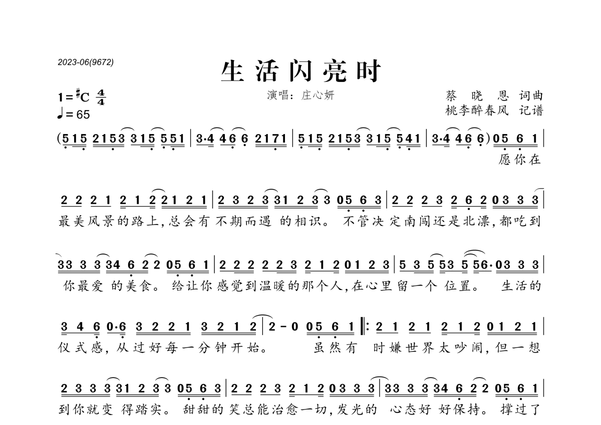 《生活闪亮时》是庄心妍演唱的一首歌曲,拍号为4/4拍,歌曲速度为每分钟65拍,这份简谱共有一张高清图谱,图谱由 @桃李醉春风 编配上传。