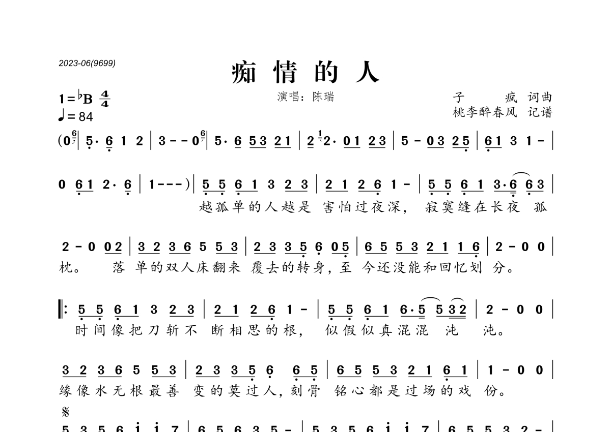 痴情的人简谱 - 陈瑞演唱