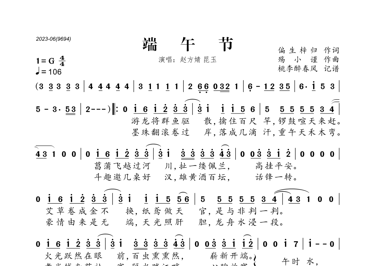 《端午节》是赵方婧 昆玉演唱的一首歌曲,拍号为4/4拍,歌曲速度为每分钟106拍,这份简谱共有一张高清图谱,图谱由 @桃李醉春风 编配上传。