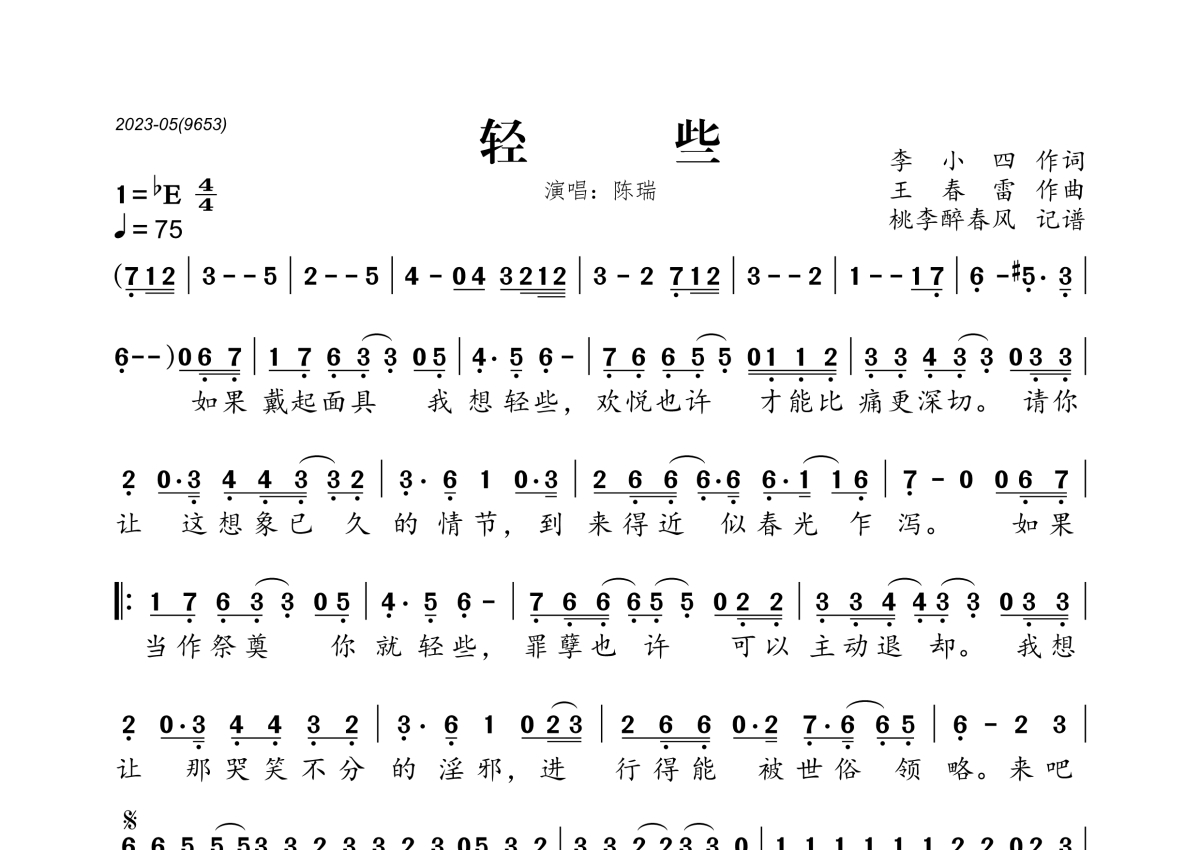《轻些》是陈瑞演唱的一首歌曲,拍号为4/4拍,歌曲速度为每分钟75拍,这份简谱共有一张高清图谱,图谱由 @桃李醉春风 编配上传。