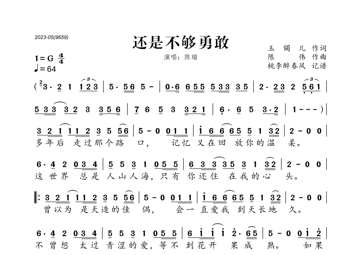 《还是不够勇敢》是陈瑞演唱的一首歌曲,拍号为4/4拍,歌曲速度为每分钟64拍,这份简谱共有一张高清图谱,图谱由 @桃李醉春风 编配上传。