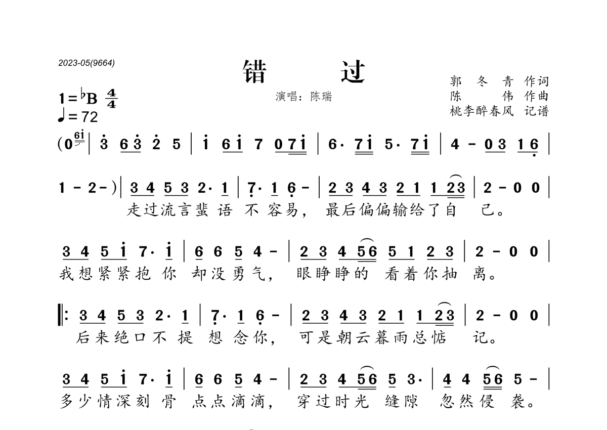 《错过》是陈瑞演唱的一首歌曲,拍号为4/4拍,歌曲速度为每分钟72拍,这份简谱共有一张高清图谱,图谱由 @桃李醉春风 编配上传。