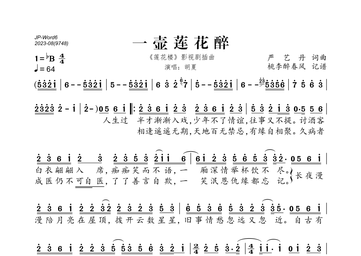 胡夏《一壶莲花醉》简谱