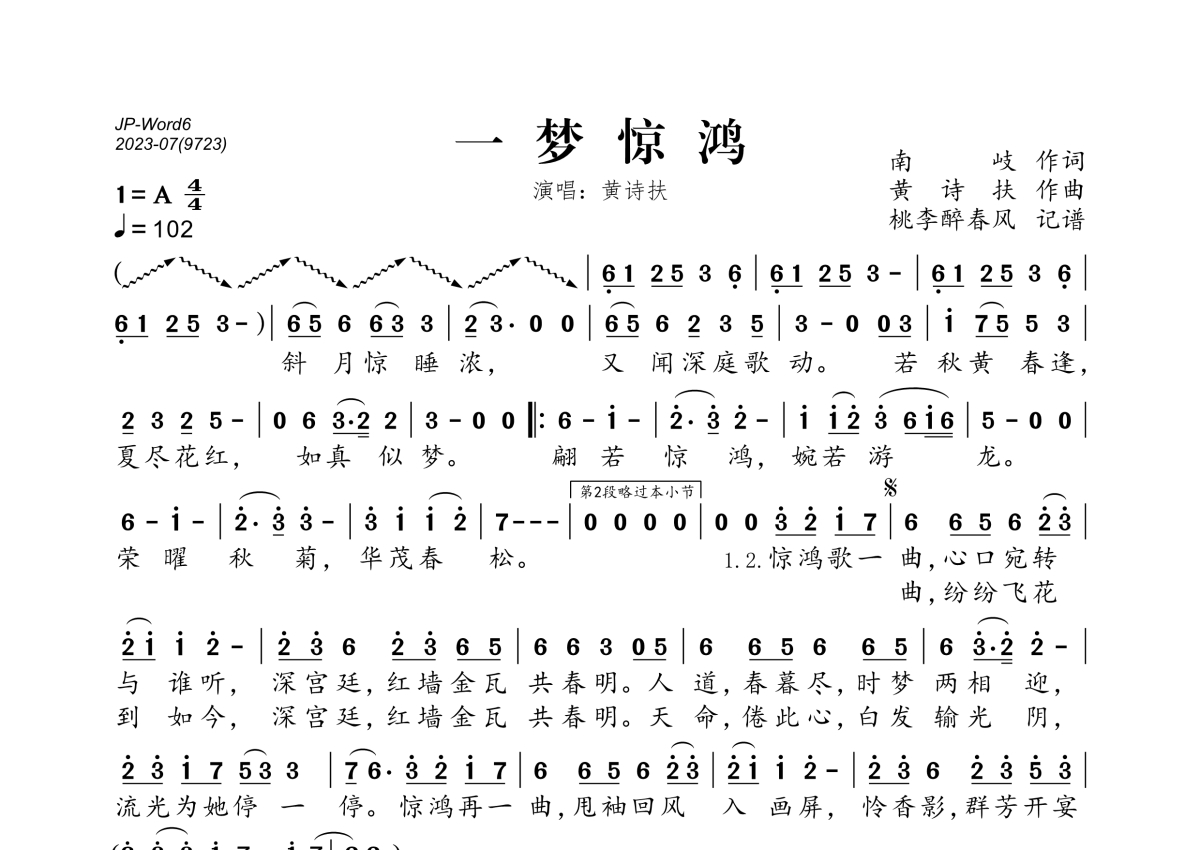 《一梦惊鸿》是黄诗扶演唱的一首歌曲,拍号为4/4拍,歌曲速度为每分钟102拍,这份简谱共有一张高清图谱,图谱由 @桃李醉春风 编配上传。