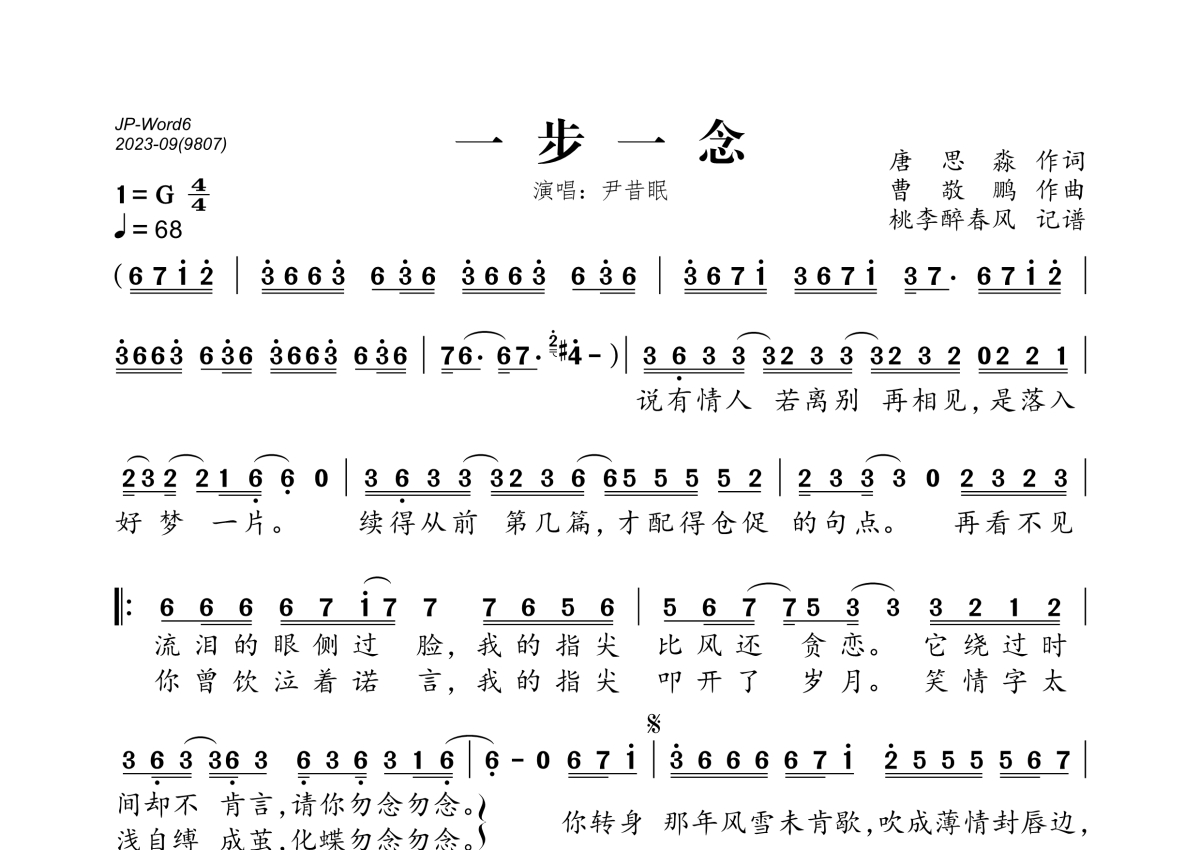 《一步一念》是尹昔眠演唱的一首歌曲,拍号为4/4拍,歌曲速度为每分钟68拍,这份简谱共有一张高清图谱,图谱由 @桃李醉春风 编配上传。