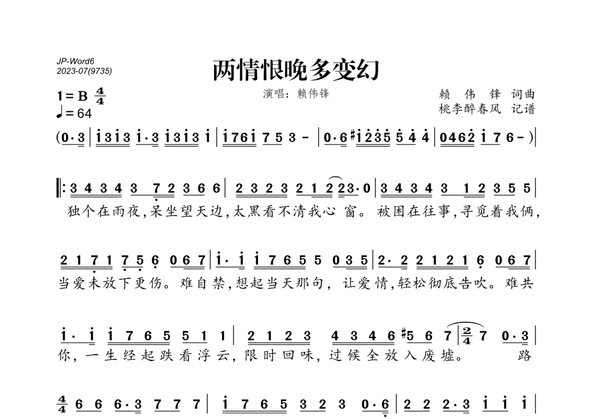 《两情恨晚多变幻》是赖伟锋演唱的一首歌曲,拍号为4/4拍,歌曲速度为每分钟64拍,这份简谱共有一张高清图谱,图谱由 @桃李醉春风 编配上传。