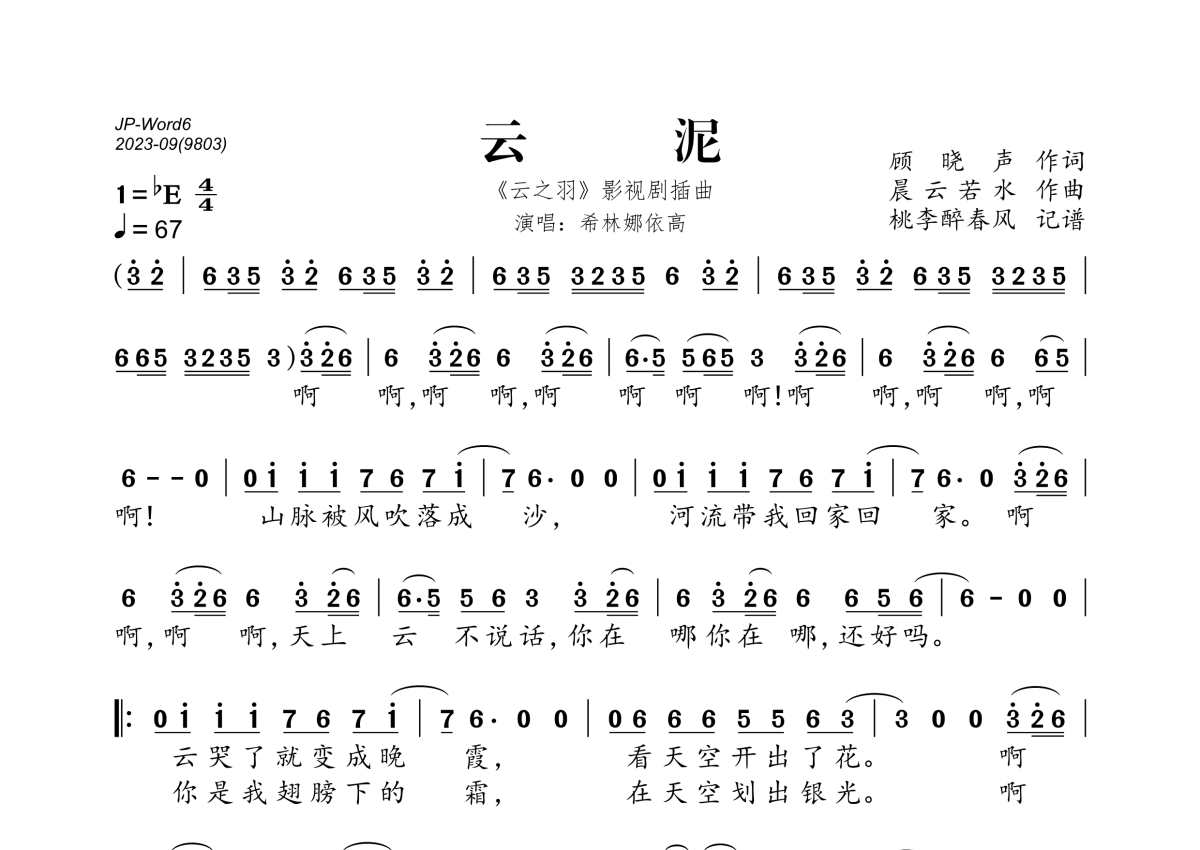 《云泥》是希林娜依高演唱的一首歌曲,拍号为4/4拍,歌曲速度为每分钟67拍,这份简谱共有一张高清图谱,图谱由 @桃李醉春风 编配上传。