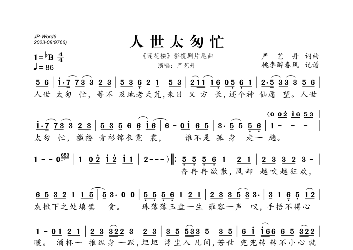 《人世太匆忙》是严艺丹演唱的一首歌曲,拍号为4/4拍,歌曲速度为每分钟86拍,这份简谱共有一张高清图谱,图谱由 @桃李醉春风 编配上传。