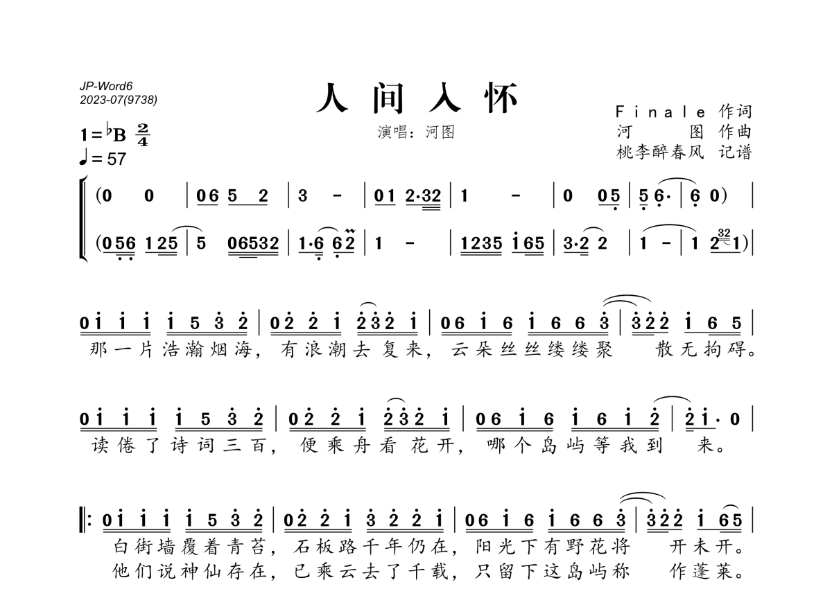 《人间入怀》是河图演唱的一首歌曲,拍号为2/4拍,歌曲速度为每分钟57拍,这份简谱共有两张高清图谱,图谱由 @桃李醉春风 编配上传。