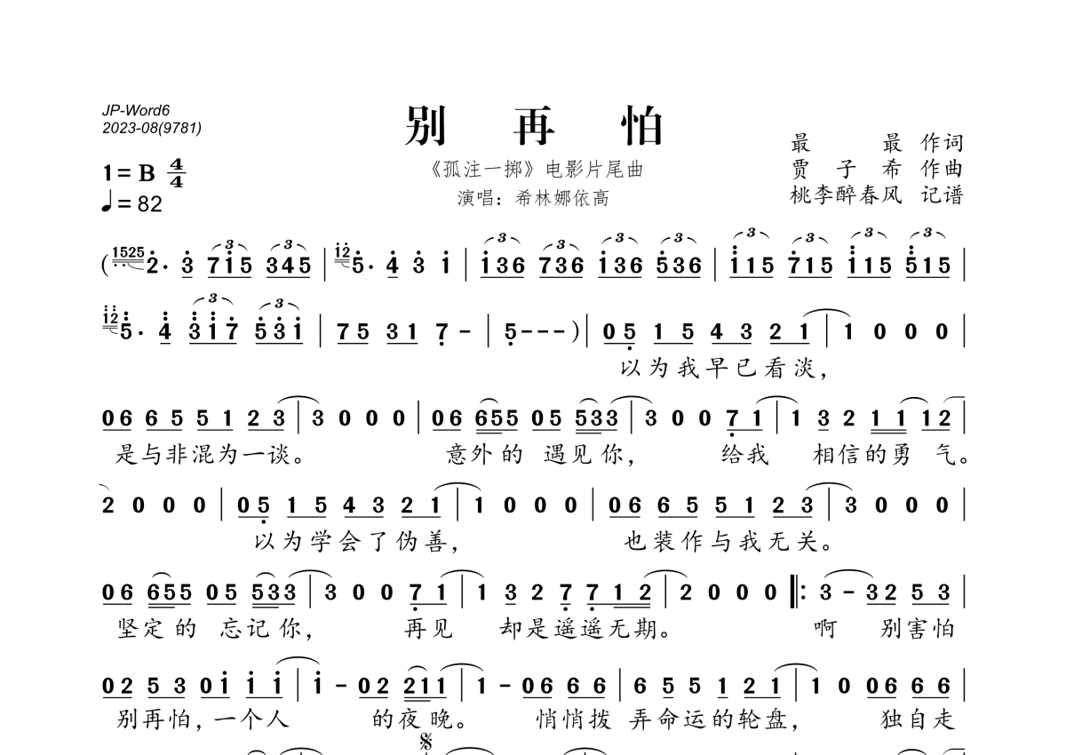 《别再怕》是希林娜依高演唱的一首歌曲,拍号为4/4拍,歌曲速度为每分钟82拍,这份简谱共有一张高清图谱,图谱由 @桃李醉春风 编配上传。