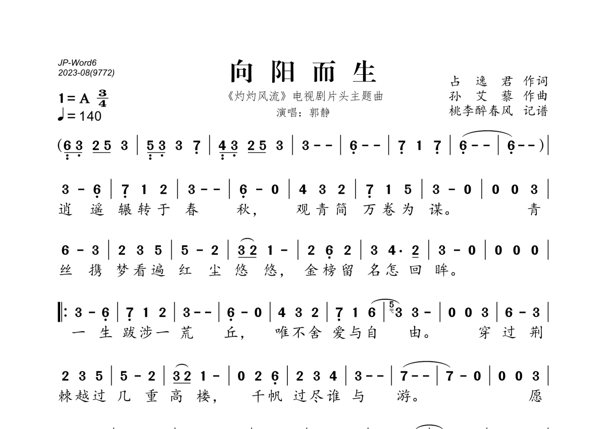 《向阳而生》是郭静演唱的一首歌曲,拍号为3/4拍,歌曲速度为每分钟140拍,这份简谱共有一张高清图谱,图谱由 @桃李醉春风 编配上传。