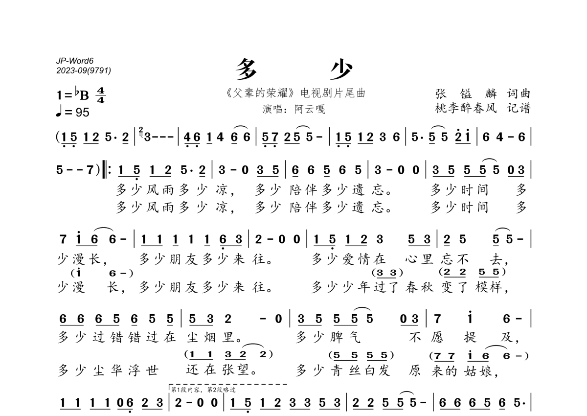 《多少》是阿云嘎演唱的一首歌曲,拍号为4/4拍,歌曲速度为每分钟95拍,这份简谱共有一张高清图谱,图谱由 @桃李醉春风 编配上传。