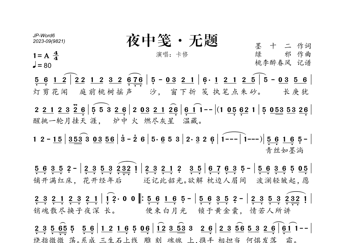 卡修《夜中笺·无题》简谱