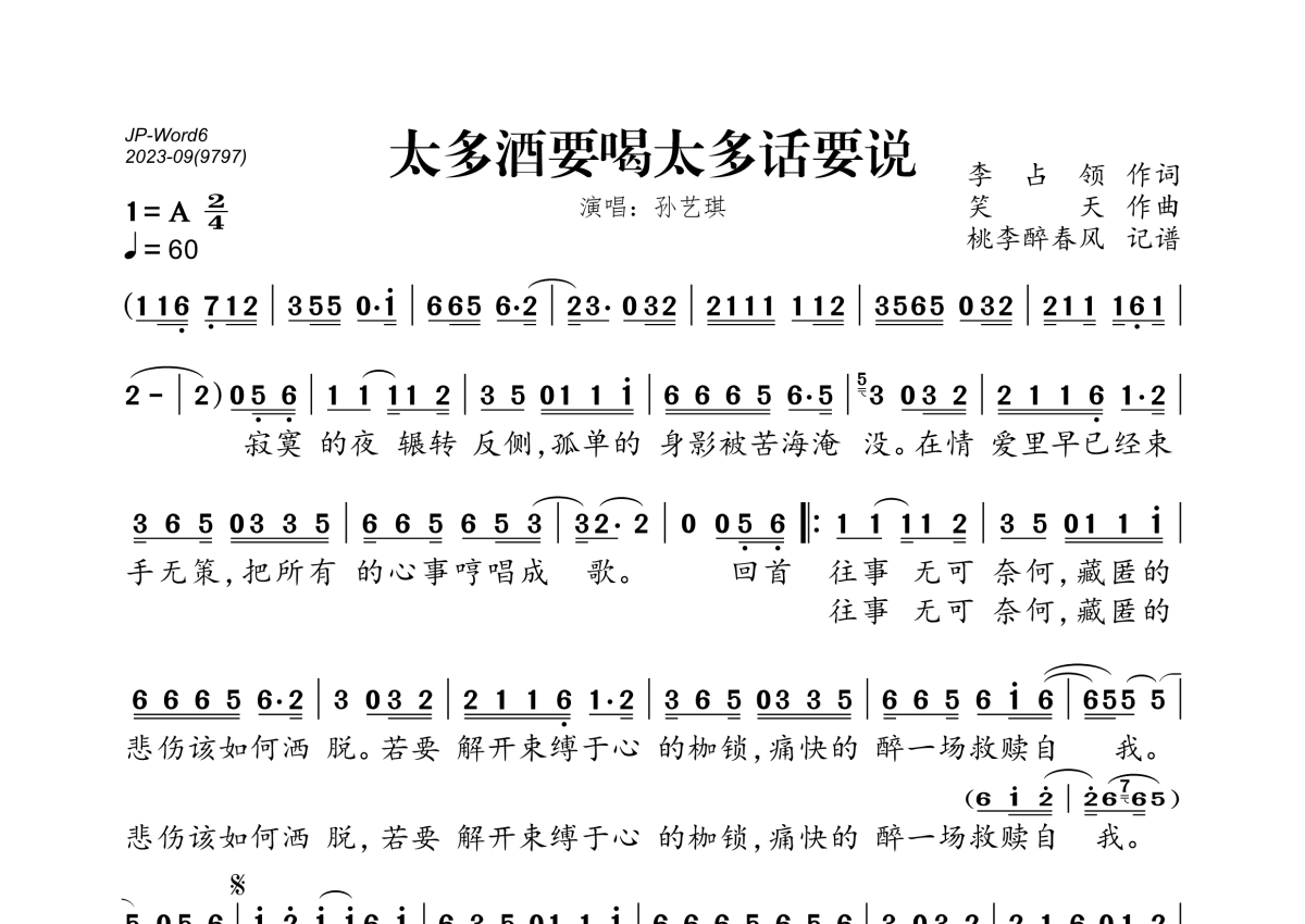 《太多酒要喝太多话要说》是孙艺琪演唱的一首歌曲,拍号为2/4拍,歌曲速度为每分钟60拍,这份简谱共有一张高清图谱,图谱由 @桃李醉春风 编配上传。