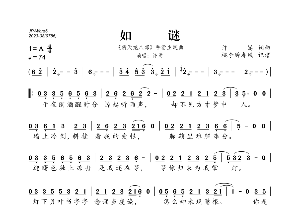 《如谜》是许嵩演唱的一首歌曲,拍号为4/4拍,歌曲速度为每分钟74拍,这份简谱共有一张高清图谱,图谱由 @桃李醉春风 编配上传。