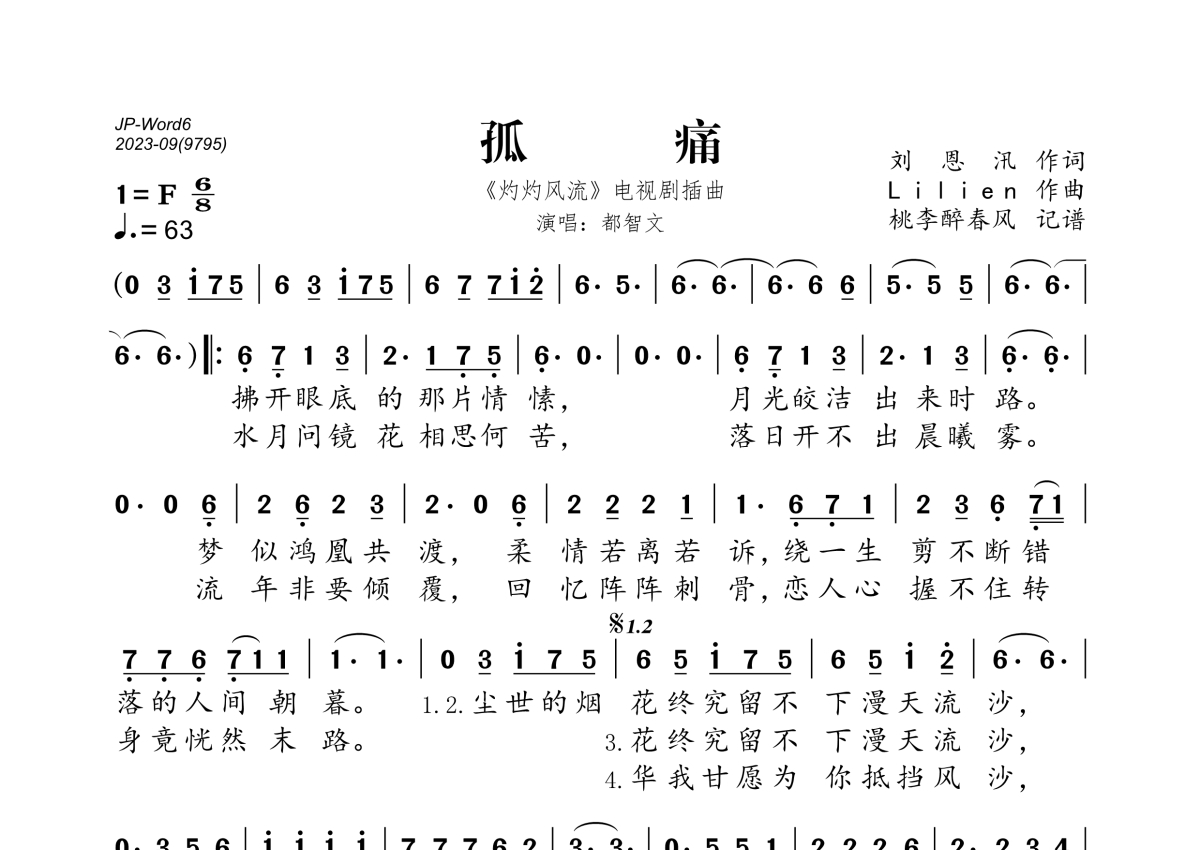 《孤痛》是都智文演唱的一首歌曲,拍号为6/8拍,歌曲速度为每分钟63拍,这份简谱共有一张高清图谱,图谱由 @桃李醉春风 编配上传。