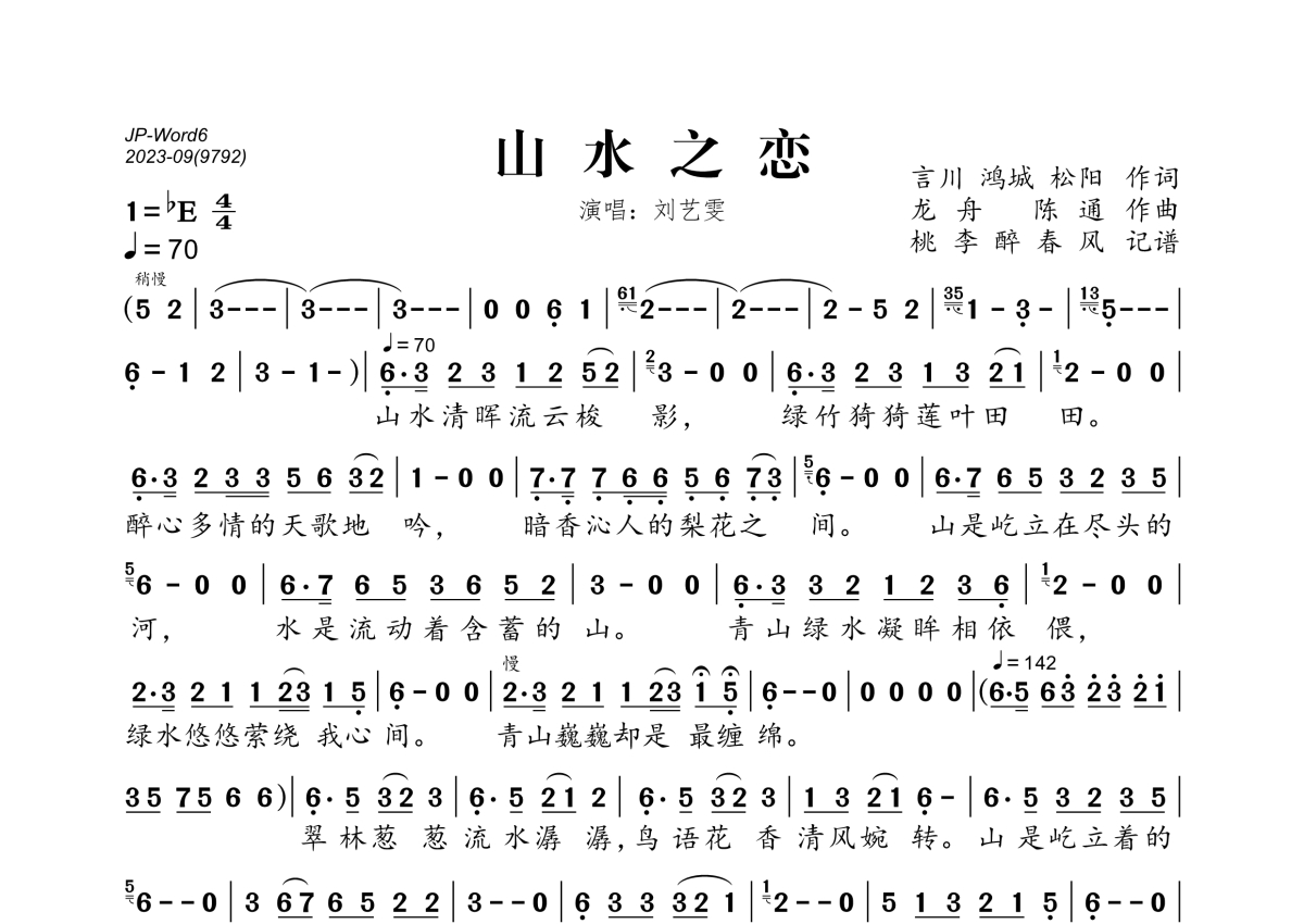 《山水之恋》是刘艺雯演唱的一首歌曲,拍号为4/4拍,歌曲速度为每分钟70拍,这份简谱共有一张高清图谱,图谱由 @桃李醉春风 编配上传。