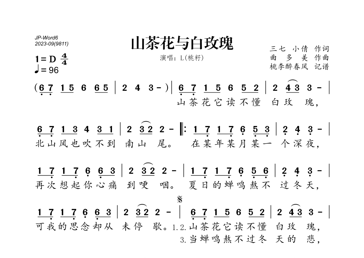 L(桃籽)《山茶花与白玫瑰》简谱