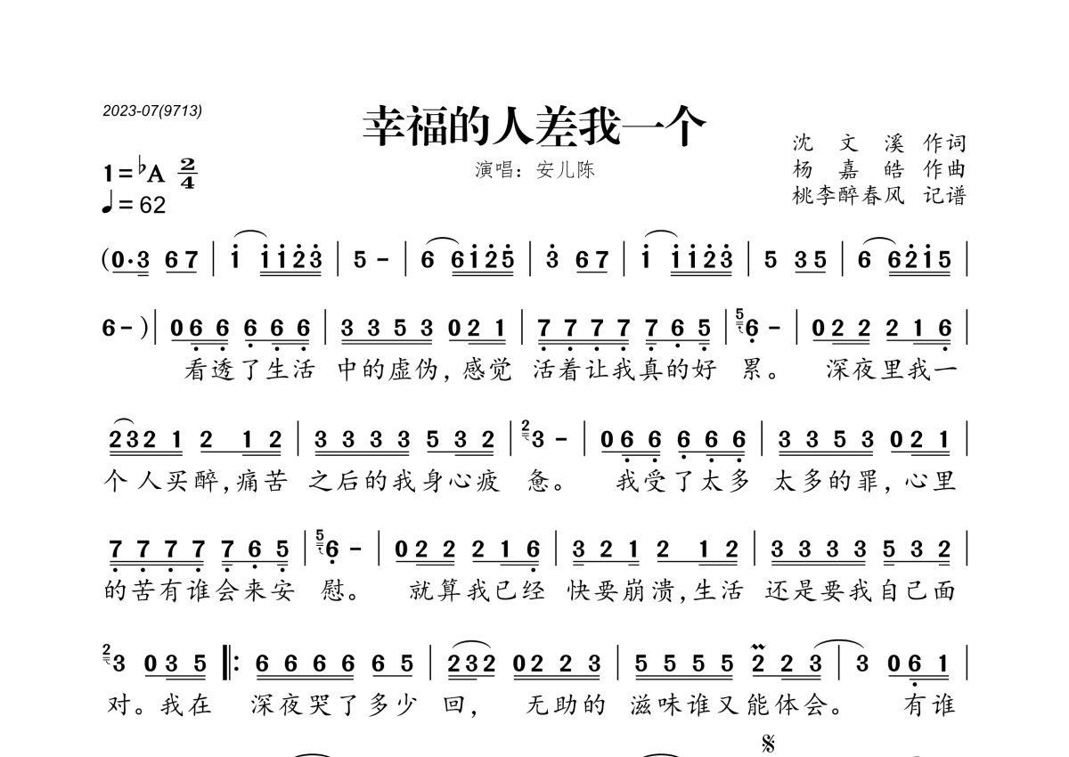 《幸福的人差我一个》是安儿陈演唱的一首歌曲,拍号为2/4拍,歌曲速度为每分钟62拍,这份简谱共有一张高清图谱,图谱由 @桃李醉春风 编配上传。