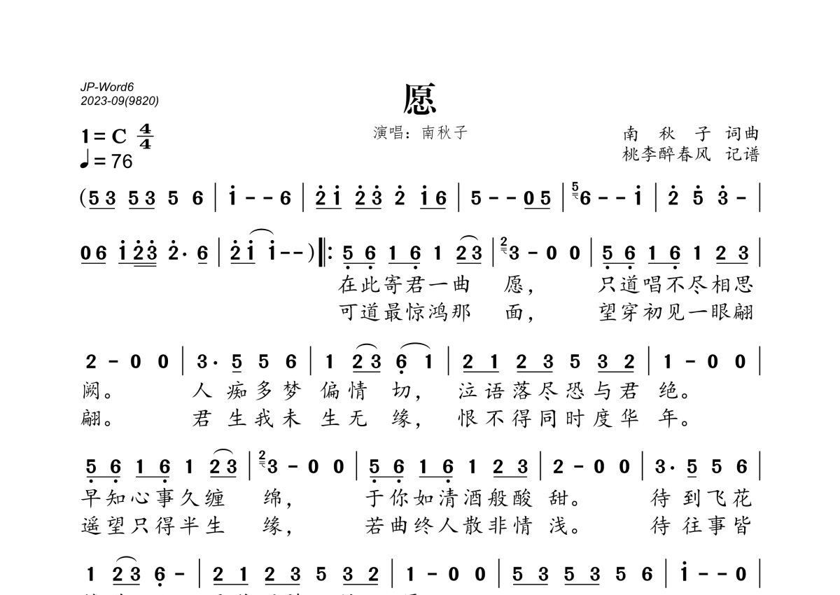 《愿》是南秋子演唱的一首歌曲,拍号为4/4拍,歌曲速度为每分钟76拍,这份简谱共有一张高清图谱,图谱由 @桃李醉春风 编配上传。