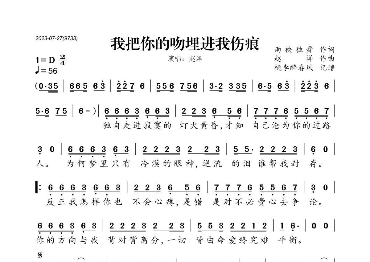 《我把你的吻埋进我伤痕》是赵洋演唱的一首歌曲,拍号为2/4拍,歌曲速度为每分钟56拍,这份简谱共有一张高清图谱,图谱由 @桃李醉春风 编配上传。