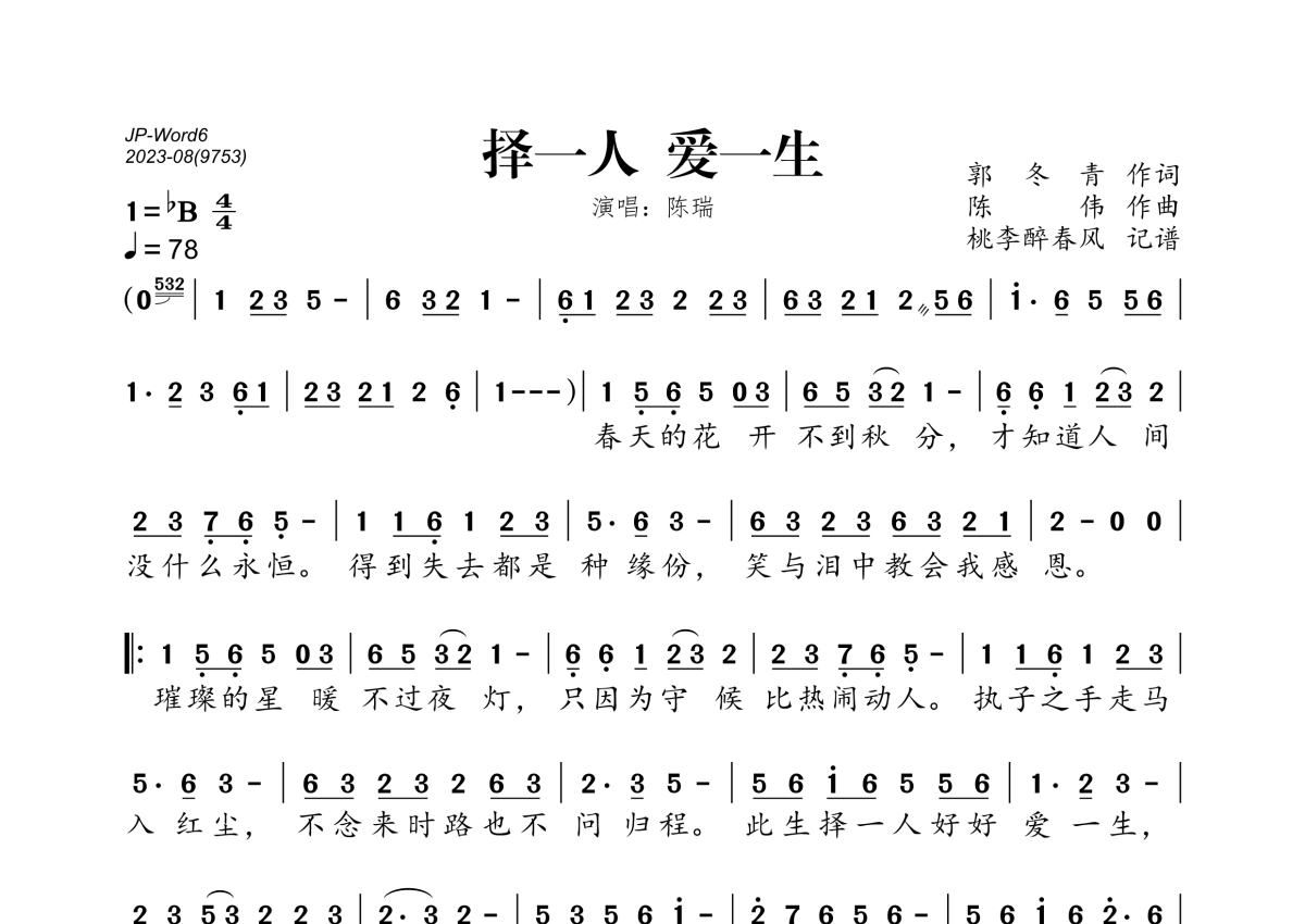 《择一人 爱一生》是陈瑞演唱的一首歌曲,拍号为4/4拍,歌曲速度为每分钟78拍,这份简谱共有一张高清图谱,图谱由 @桃李醉春风 编配上传。