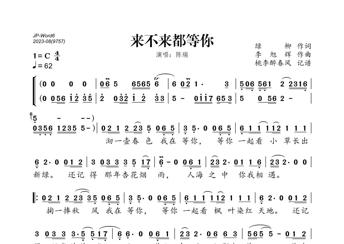 《来不来都等你》是陈瑞演唱的一首歌曲,拍号为4/4拍,歌曲速度为每分钟62拍,这份简谱共有一张高清图谱,图谱由 @桃李醉春风 编配上传。