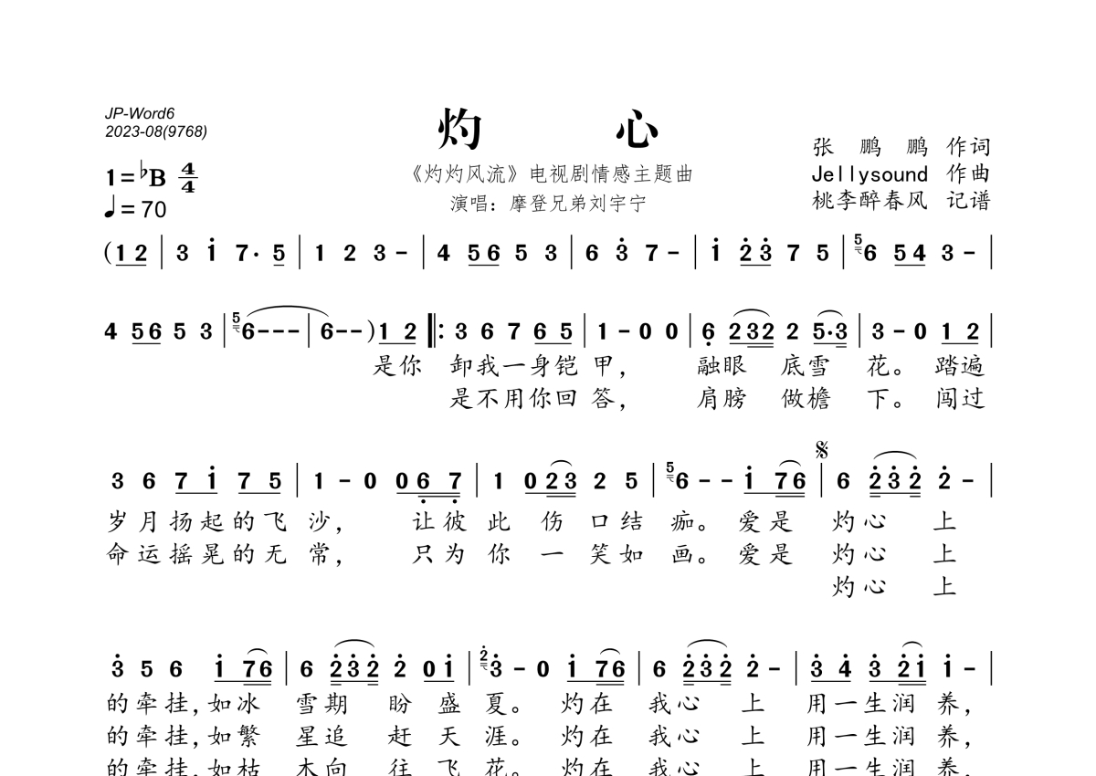 《灼心》是摩登兄弟刘宇宁演唱的一首歌曲,拍号为4/4拍,歌曲速度为每分钟70拍,这份简谱共有一张高清图谱,图谱由 @桃李醉春风 编配上传。