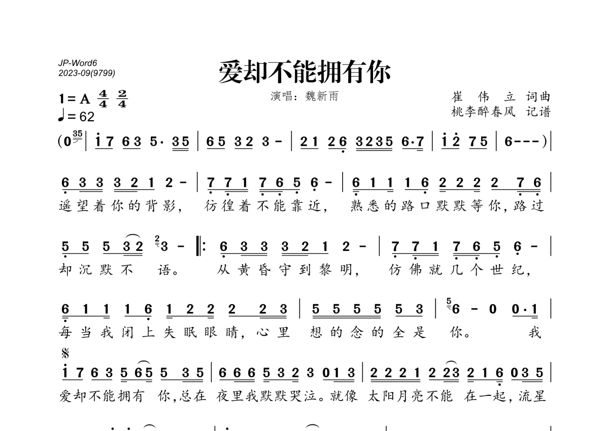 《爱却不能拥有你》是魏新雨演唱的一首歌曲,拍号为4/4拍,歌曲速度为每分钟62拍,这份简谱共有一张高清图谱,图谱由 @桃李醉春风 编配上传。