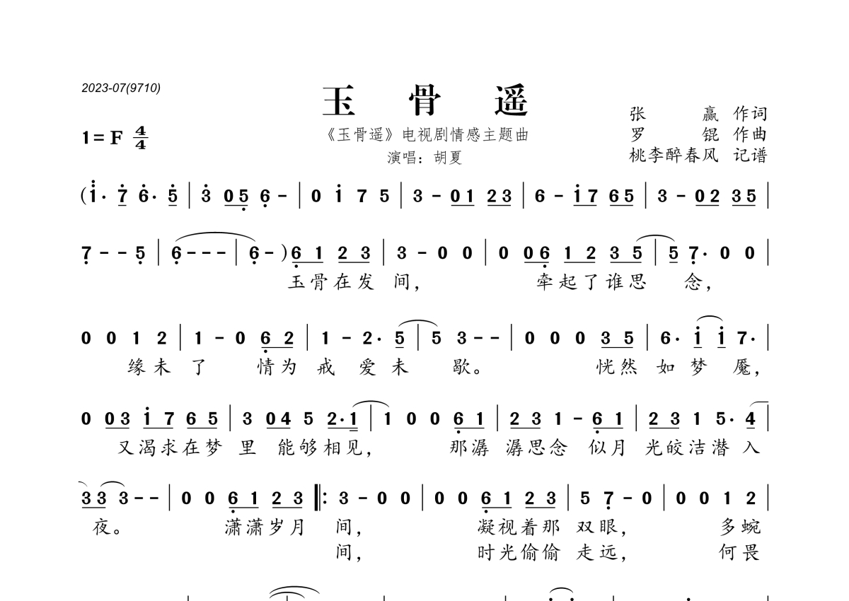 《玉骨遥》是胡夏演唱的一首歌曲,拍号为4/4拍,这份简谱共有一张高清图谱,图谱由 @桃李醉春风 编配上传。