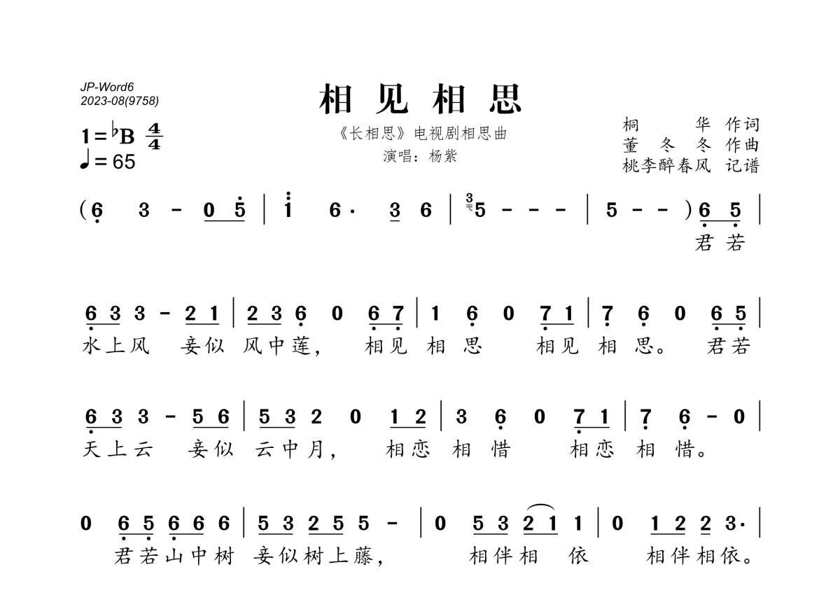 《相见相思》是杨紫演唱的一首歌曲,拍号为4/4拍,歌曲速度为每分钟65拍,这份简谱共有一张高清图谱,图谱由 @桃李醉春风 编配上传。