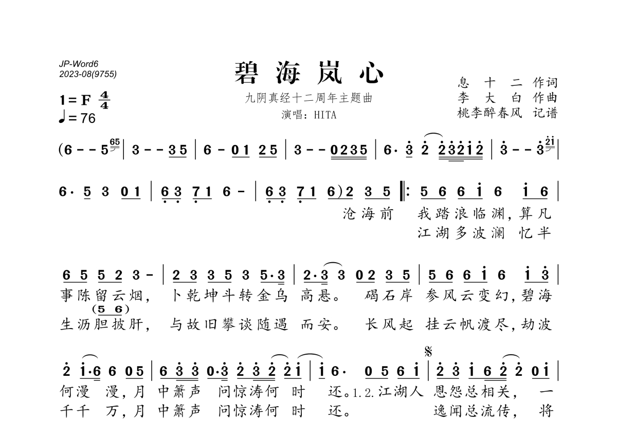 《碧海岚心》是HITA/九阴真经演唱的一首歌曲,拍号为4/4拍,歌曲速度为每分钟76拍,这份简谱共有一张高清图谱,图谱由 @桃李醉春风 编配上传。