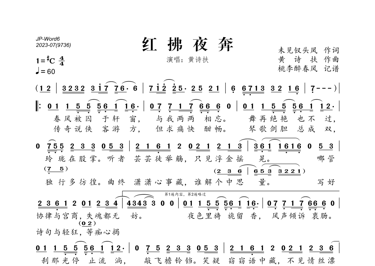 《红拂夜奔》是黄诗扶演唱的一首歌曲,拍号为4/4拍,歌曲速度为每分钟60拍,这份简谱共有一张高清图谱,图谱由 @桃李醉春风 编配上传。