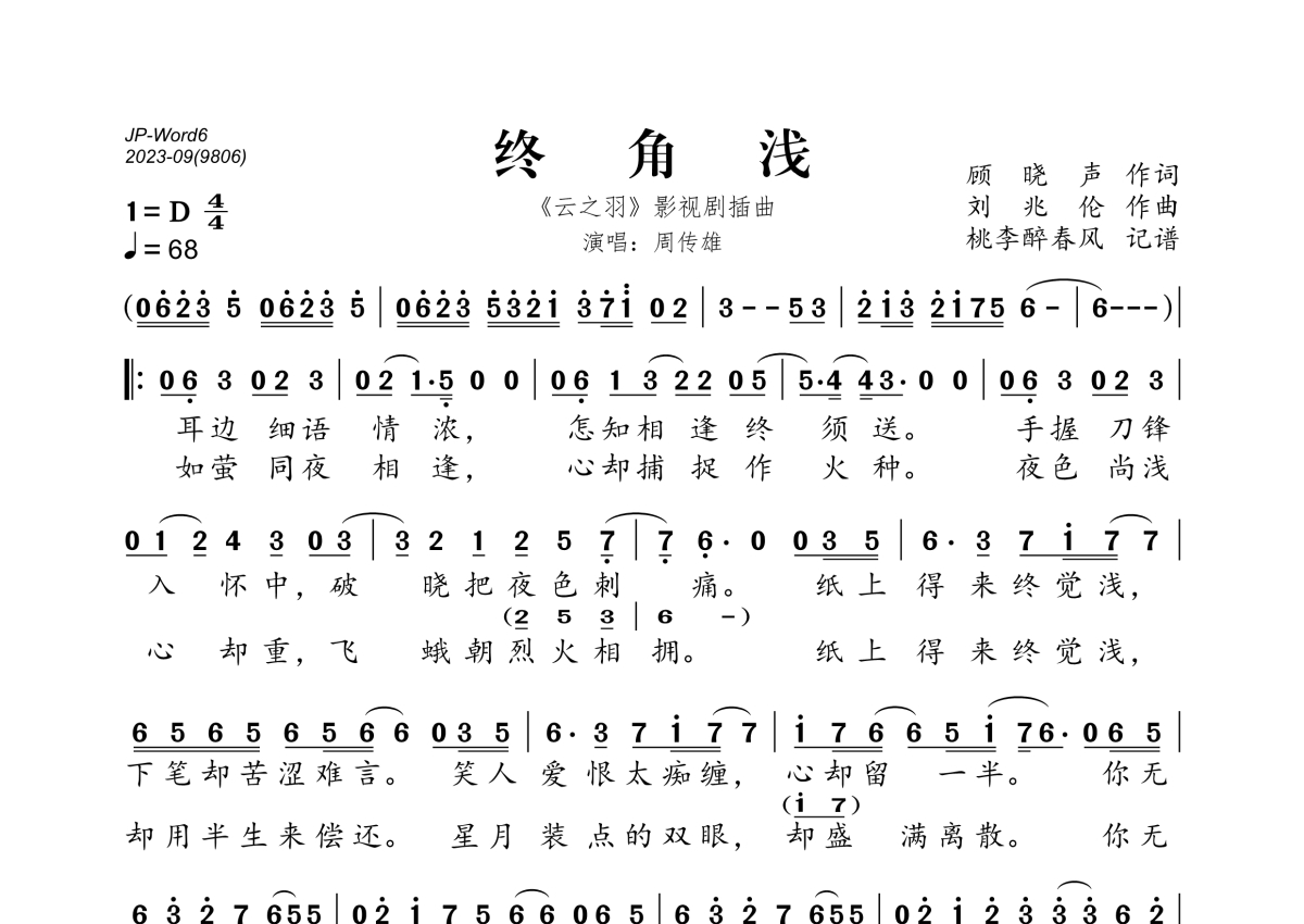 《终角浅》是周传雄演唱的一首歌曲,拍号为4/4拍,歌曲速度为每分钟68拍,这份简谱共有一张高清图谱,图谱由 @桃李醉春风 编配上传。