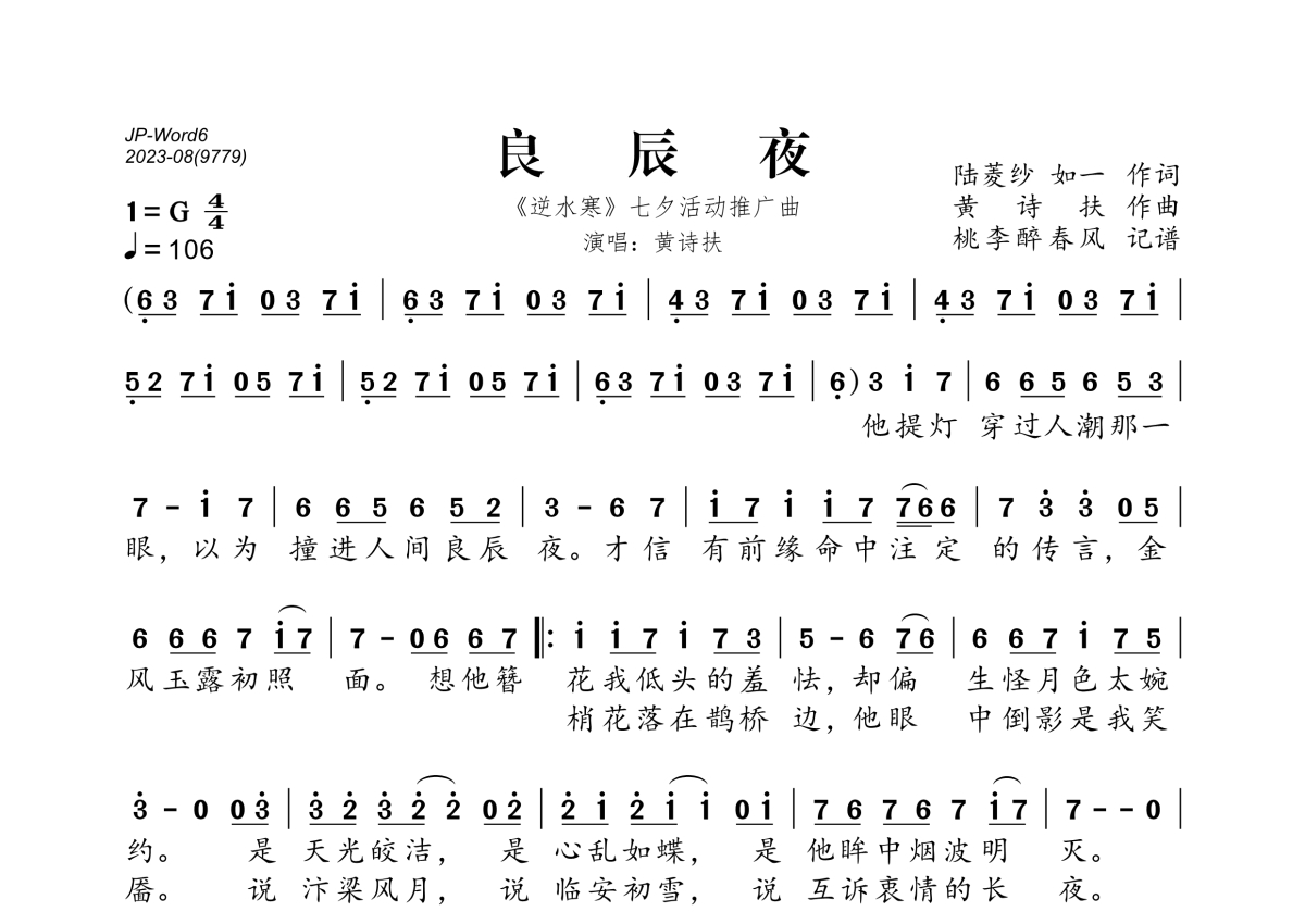 《良辰夜》是黄诗扶演唱的一首歌曲,拍号为4/4拍,歌曲速度为每分钟106拍,这份简谱共有两张高清图谱,图谱由 @桃李醉春风 编配上传。