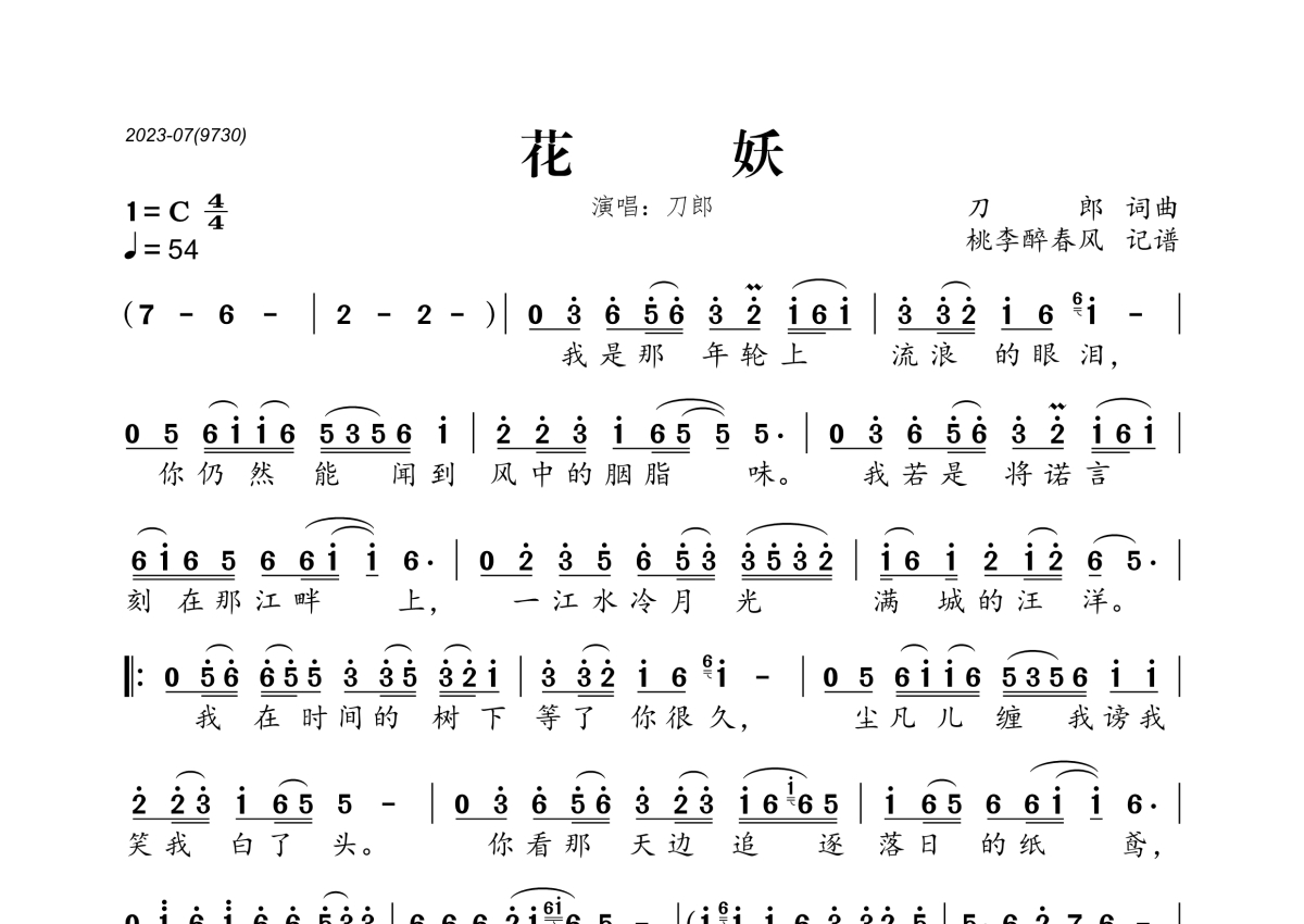 《花妖》是刀郎演唱的一首歌曲,拍号为4/4拍,歌曲速度为每分钟54拍,这份简谱共有一张高清图谱,图谱由 @桃李醉春风 编配上传。