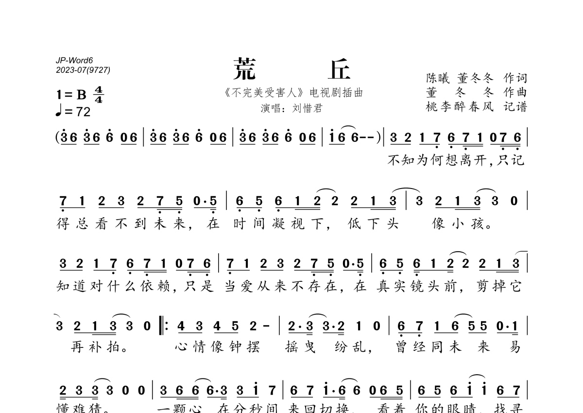 《荒丘》是刘惜君演唱的一首歌曲,拍号为4/4拍,歌曲速度为每分钟72拍,这份简谱共有一张高清图谱,图谱由 @桃李醉春风 编配上传。
