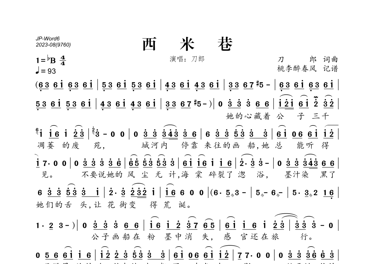 《西米巷》是刀郎演唱的一首歌曲,拍号为4/4拍,歌曲速度为每分钟93拍,这份简谱共有一张高清图谱,图谱由 @桃李醉春风 编配上传。