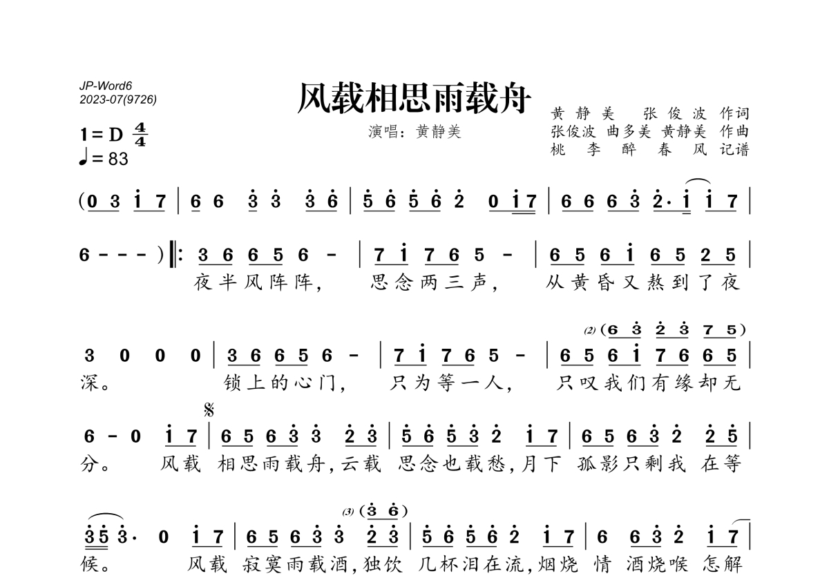 《风载相思雨载舟》是黄静美演唱的一首歌曲,拍号为4/4拍,歌曲速度为每分钟83拍,这份简谱共有一张高清图谱,图谱由 @桃李醉春风 编配上传。