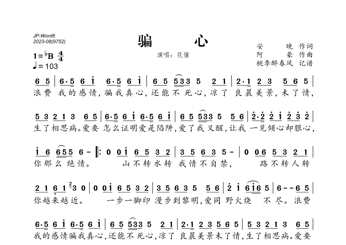《骗心》是花僮演唱的一首歌曲,拍号为4/4拍,歌曲速度为每分钟103拍,这份简谱共有一张高清图谱,图谱由 @桃李醉春风 编配上传。