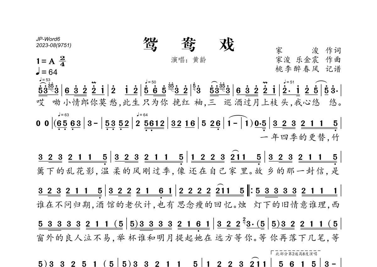 《鸳鸯戏》是黄龄演唱的一首歌曲,拍号为2/4拍,歌曲速度为每分钟64拍,这份简谱共有一张高清图谱,图谱由 @桃李醉春风 编配上传。