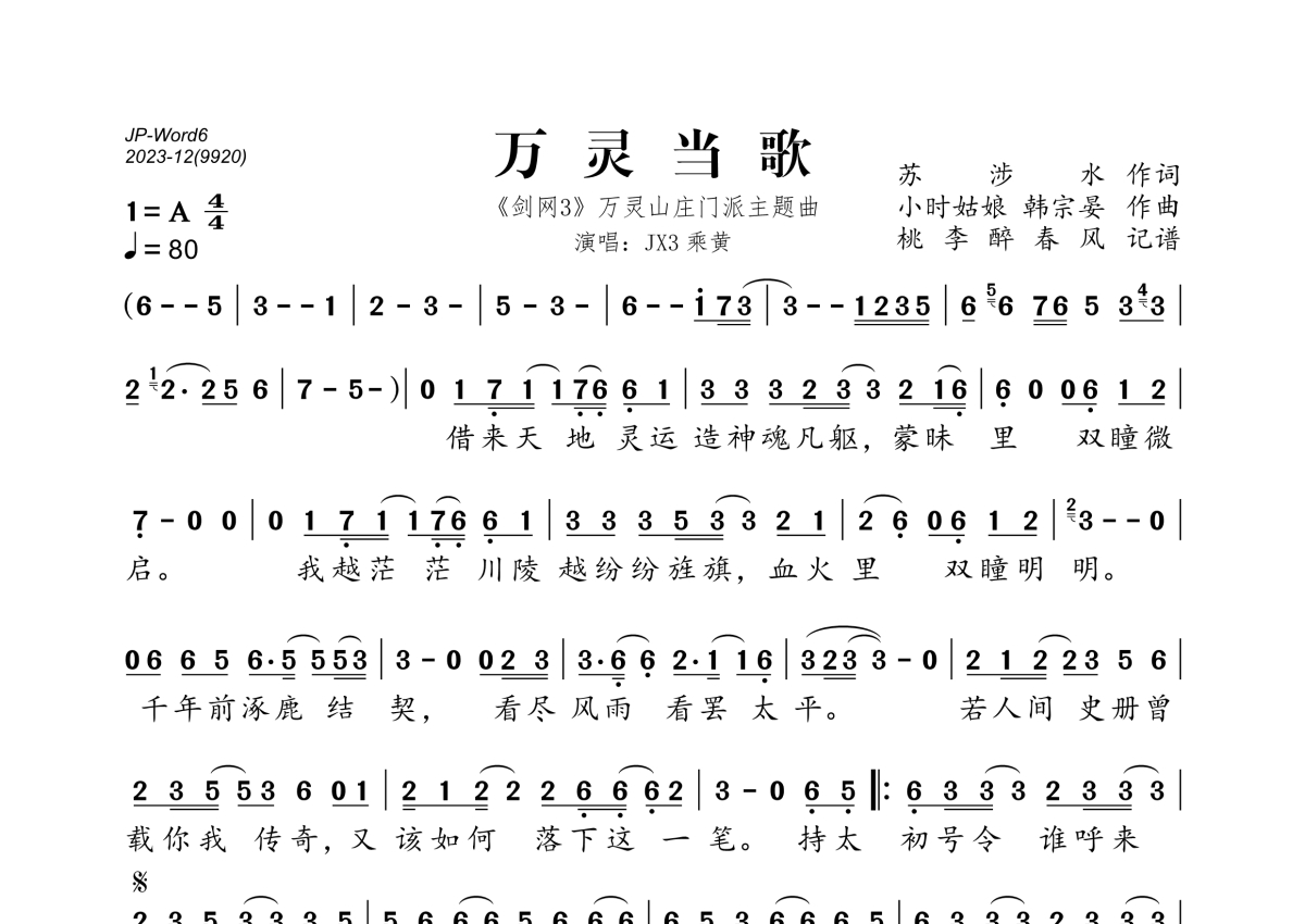 《万灵当歌》是JX3乘黄演唱的一首歌曲,拍号为4/4拍,歌曲速度为每分钟80拍,这份简谱共有一张高清图谱,图谱由 @桃李醉春风 编配上传。