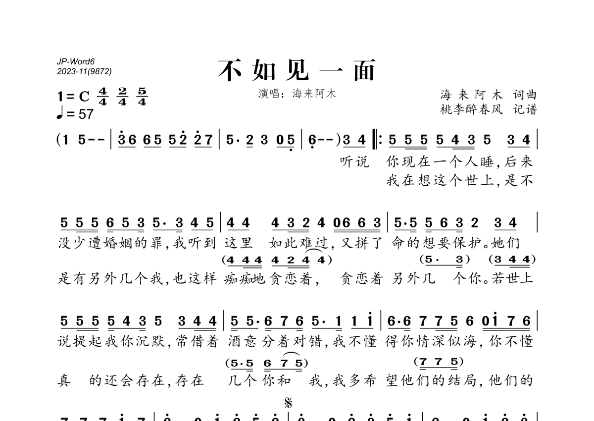 《不如见一面》是海来阿木演唱的一首歌曲,拍号为4/4拍,歌曲速度为每分钟57拍,这份简谱共有一张高清图谱,图谱由 @桃李醉春风 编配上传。