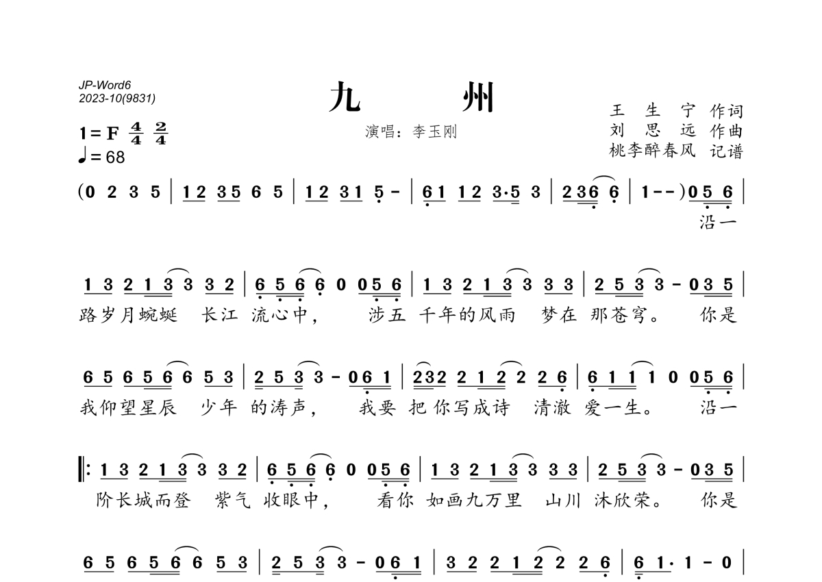 《九州》是李玉刚演唱的一首歌曲,拍号为4/4拍,歌曲速度为每分钟68拍,这份简谱共有一张高清图谱,图谱由 @桃李醉春风 编配上传。