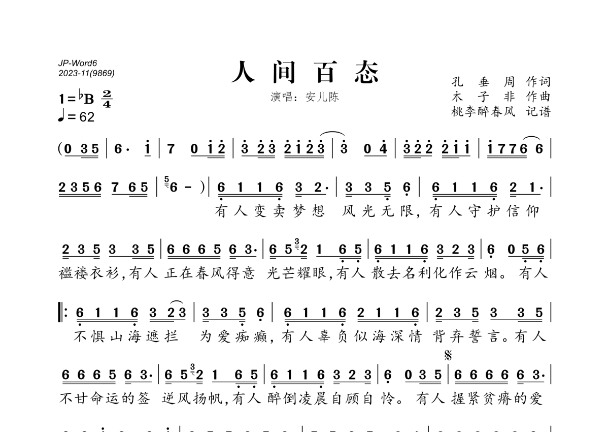 《人间百态》是安儿陈演唱的一首歌曲,拍号为2/4拍,歌曲速度为每分钟62拍,这份简谱共有一张高清图谱,图谱由 @桃李醉春风 编配上传。